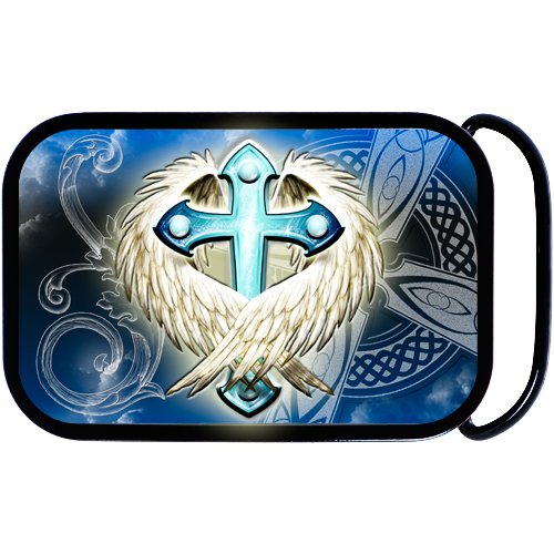 Embrace your holy side with this angelic winged cross buckle. Create your own look with this interchangeable buckle. Full color belt buckle.. Specifications: 3.5 x 2.5 inches, (strap belts sold separately). Please visit the Belt Buckles, Strap Belts section for a wide range of selections.. Embraced Wing Cross Belt Buckle
